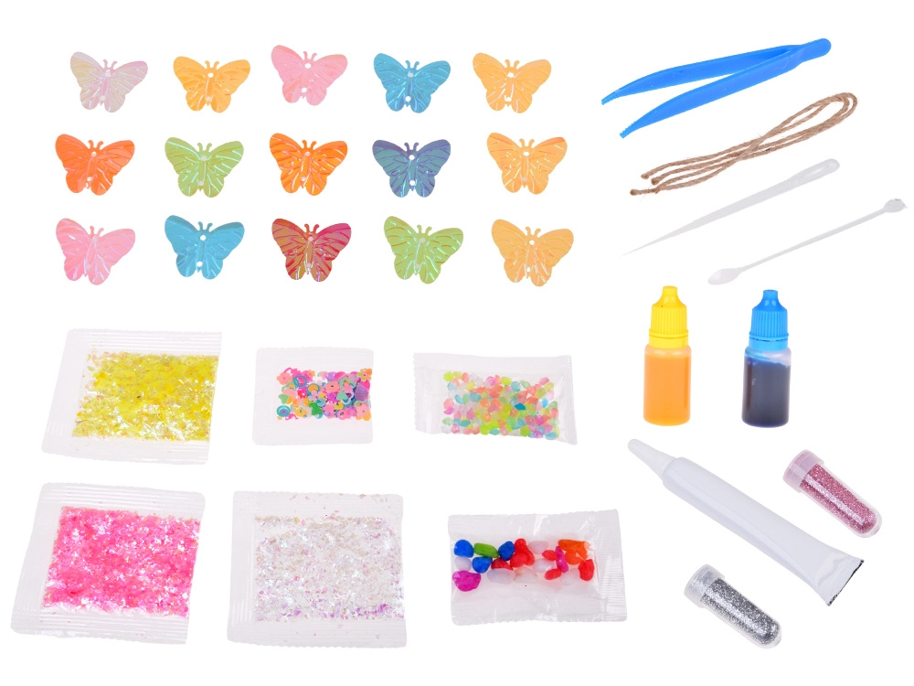 - Set complet – 12 mini sticluțe de forme diferite, sclipici, pigmenți, decorațiuni, instrumente.