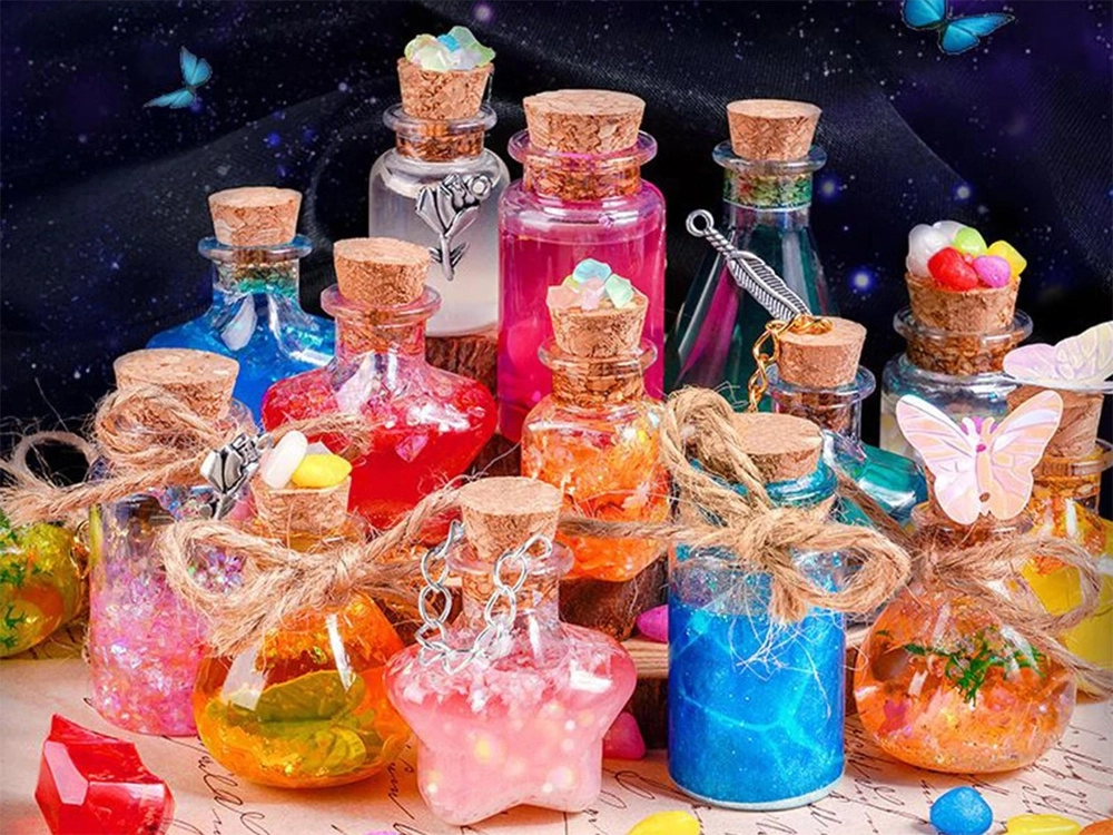 Sticlă transparentă în forme variate (cilindru, picătură, stea etc.) pentru un efect superb al poțiunilor. Ideale pentru sclipici, mărgele și lichide colorate.