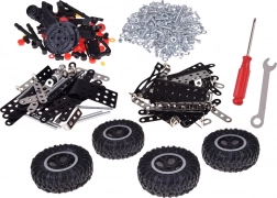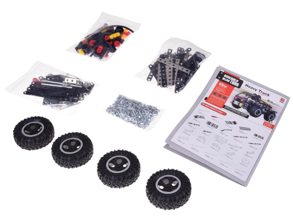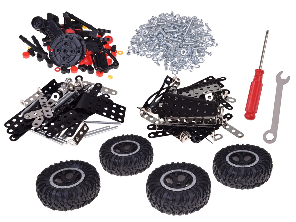 Tot ce ai nevoie într-o singură cutie: 475 piese, anvelope din cauciuc, accesorii din plastic, șuruburi și piulițe, șurubelniță, cheie și instrucțiuni ilustrate.