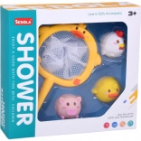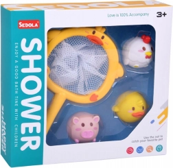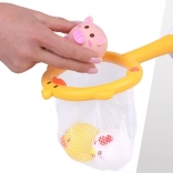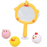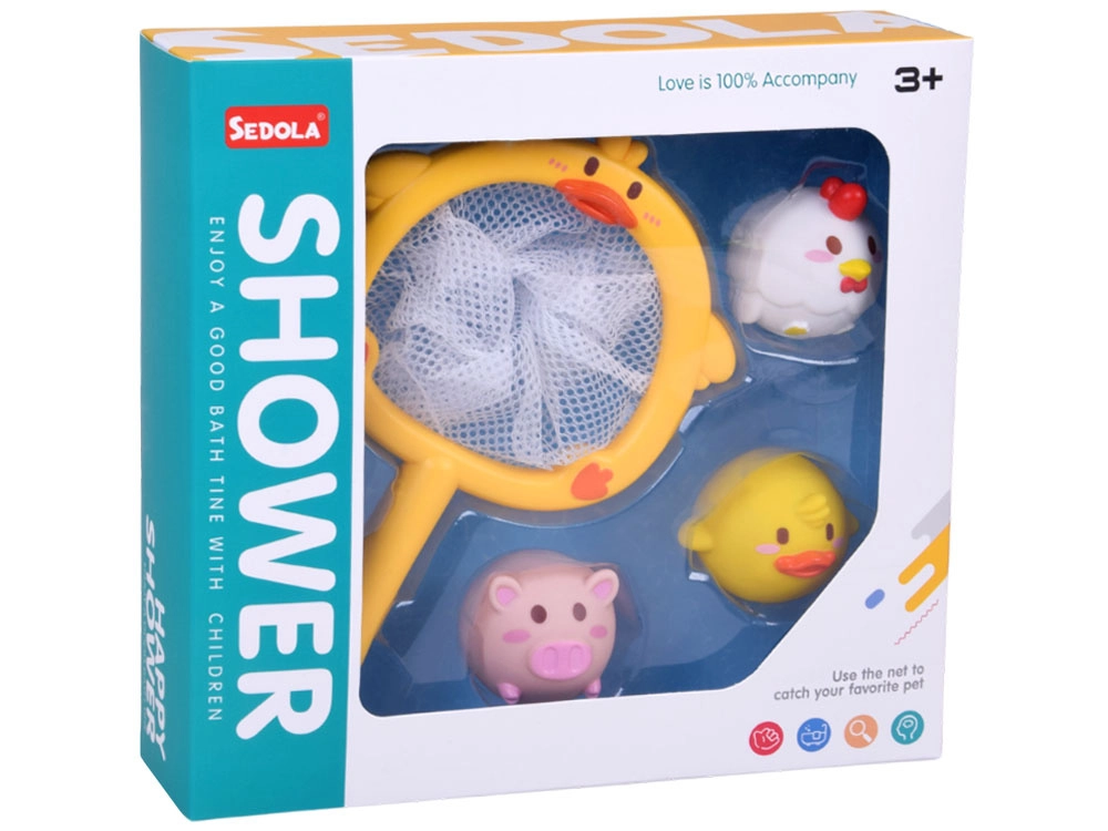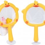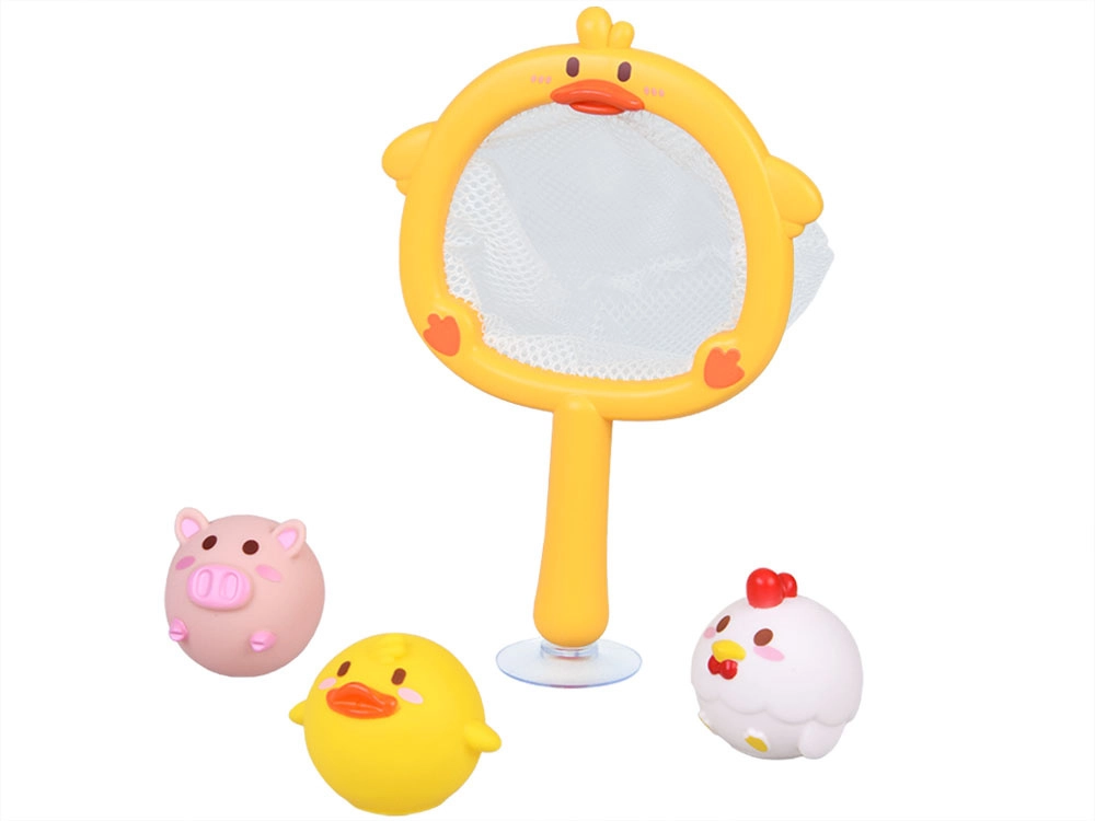 Acest set drăgălaș pentru baie transformă fiecare băiță într-un joc distractiv. Copiii pot prinde animăluțele plutitoare cu ajutorul plasei în formă de rață și își pot exersa motricitatea fină, coordo-narea mână–ochi și răbdarea. Ventuza de pe mâner permite fixarea plasei pe suprafața netedă a căzii sau a faianței, astfel încât jucăriile se usucă ușor după baie și rămân ordonat depozitate.