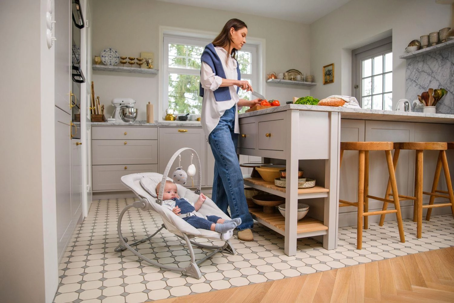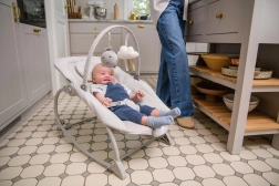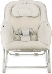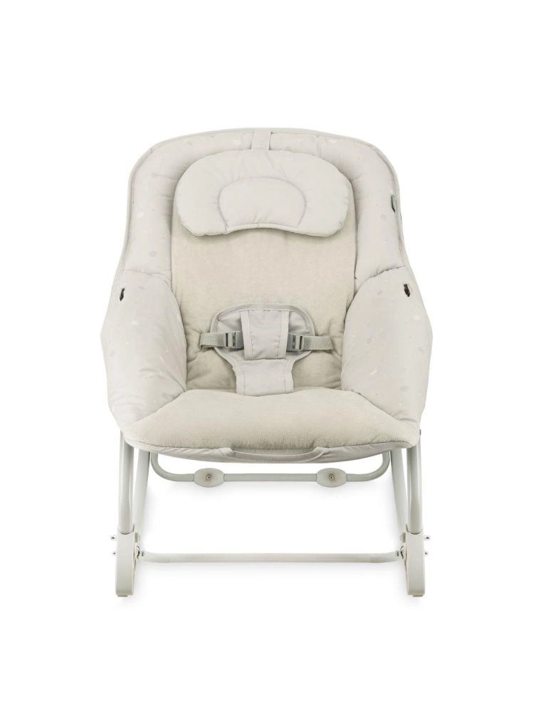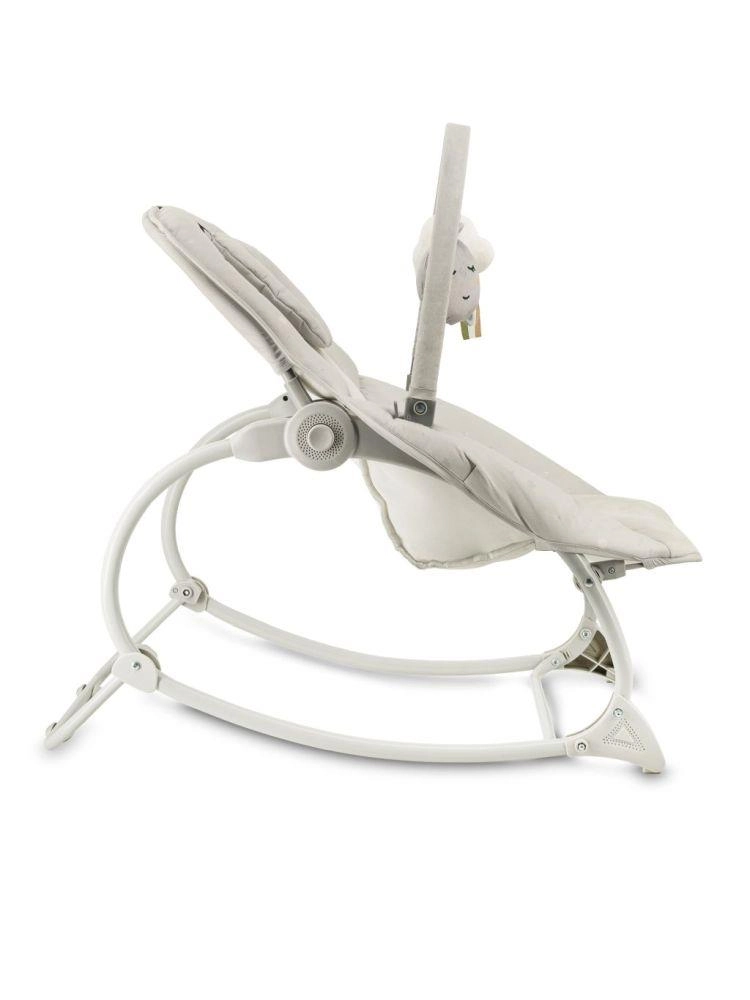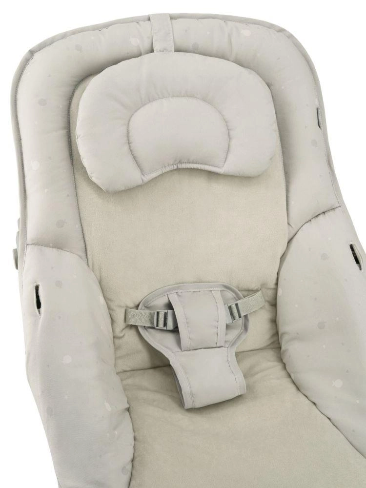 Pentru siguranță, are centură de siguranță în 3 puncte și chingă inghinală lată, iar cadrul stabil permite și blocarea legănării. Husele detașabile și lavabile facilitează întreținerea. Bara cu două jucării moi susține dezvoltarea senzorială și îl distrează pe bebeluș când ai nevoie de mâini libere.