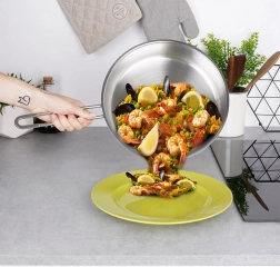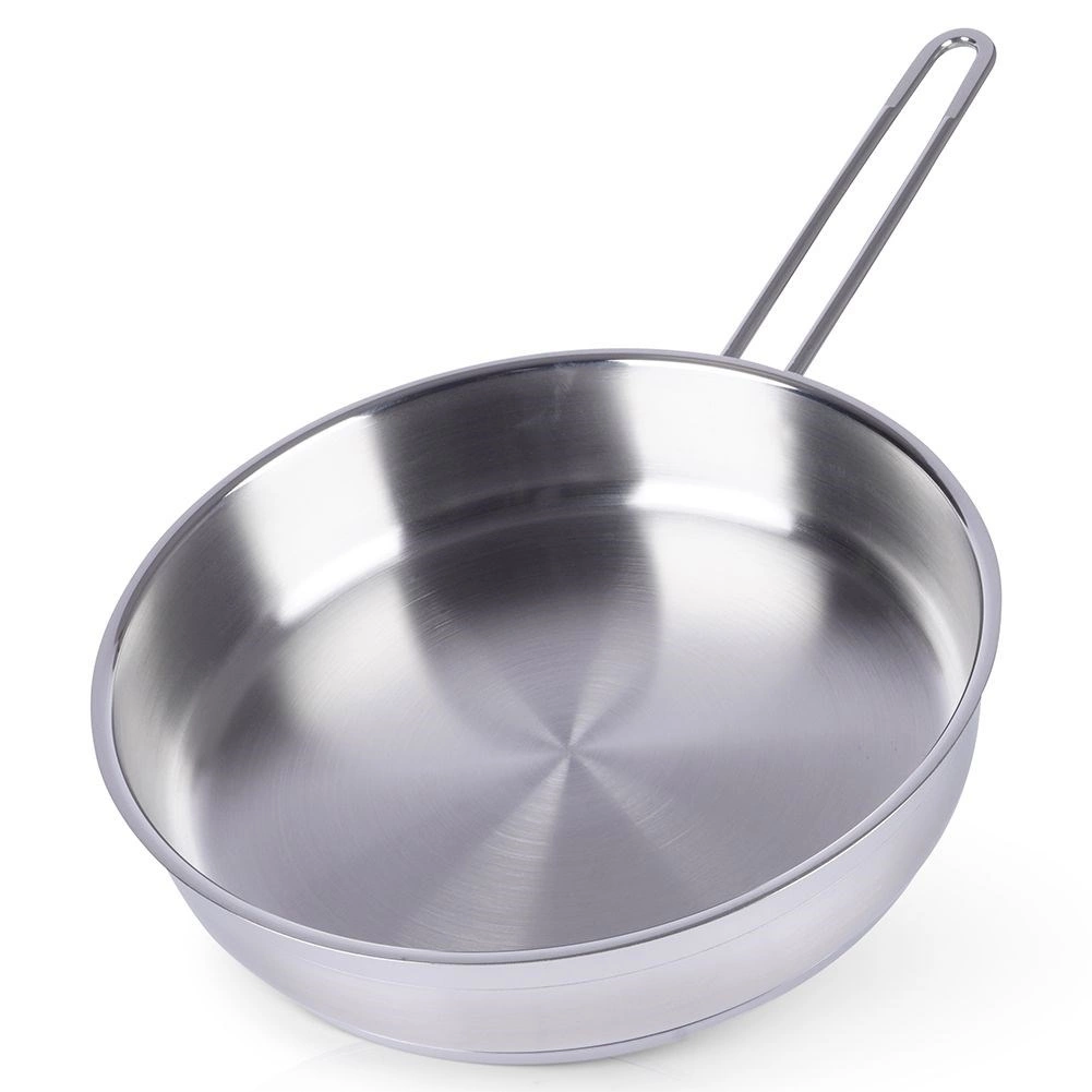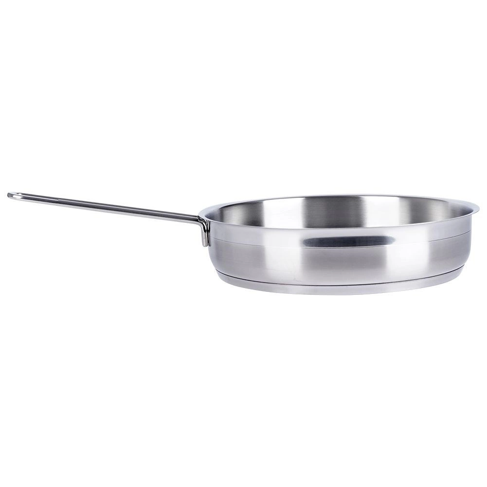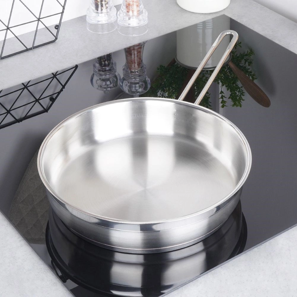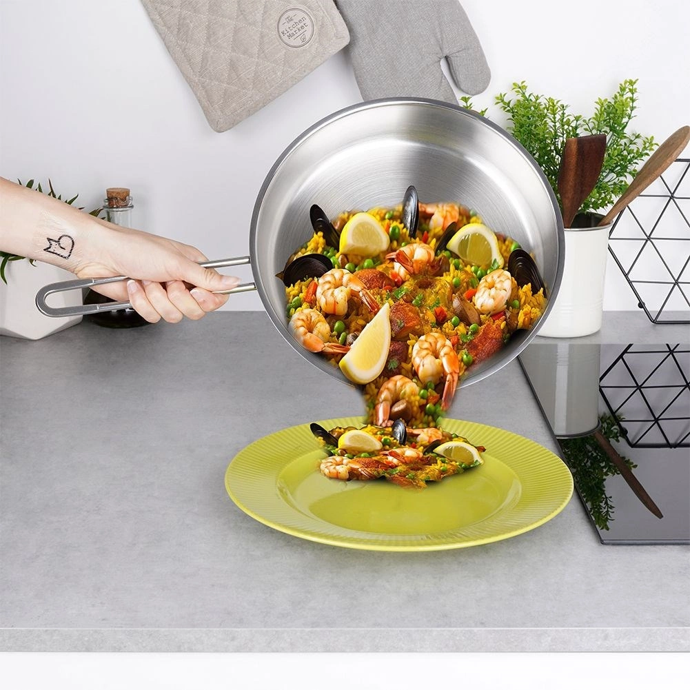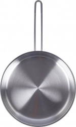 Această tigaie din inox, cu aspect atemporal, este o alegere excelentă pentru prepararea cărnii, legumelor și a clătitelor. Fabricată din oțel inoxidabil de calitate cu suprafață mată și o bandă elegantă lucioasă pe partea superioară, oferă durată de viață îndelungată și rezistență la coroziune. Pereții masivi și construcția stabilă asigură distribuție uniformă a căldurii și performanță fiabilă la prăjire și sotare.