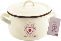Elegantă oală emailată cu capac și mânere confortabile pentru gătit zilnic. Are un volum de 2,3 l, diametru de 16 cm și este potrivită pentru toate tipurile de plite, inclusiv inducție. Oțel emailat sigur pentru sănătate, în culoare crem cu motiv inimă, ușor de întreținut și posibilitate de spălare în mașina de spălat vase.
