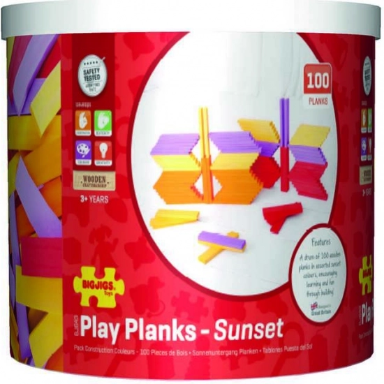 Acest set creativ oferă 100 de piese din lemn, lucrate cu atenție, cu care copiii pot crea cu ușurință forme originale, construcții și povești inspirate de apusul soarelui. Datorită formelor și culorilor variate, jocul stimulează imaginația, coordonarea mână–ochi și motricitatea fină.
