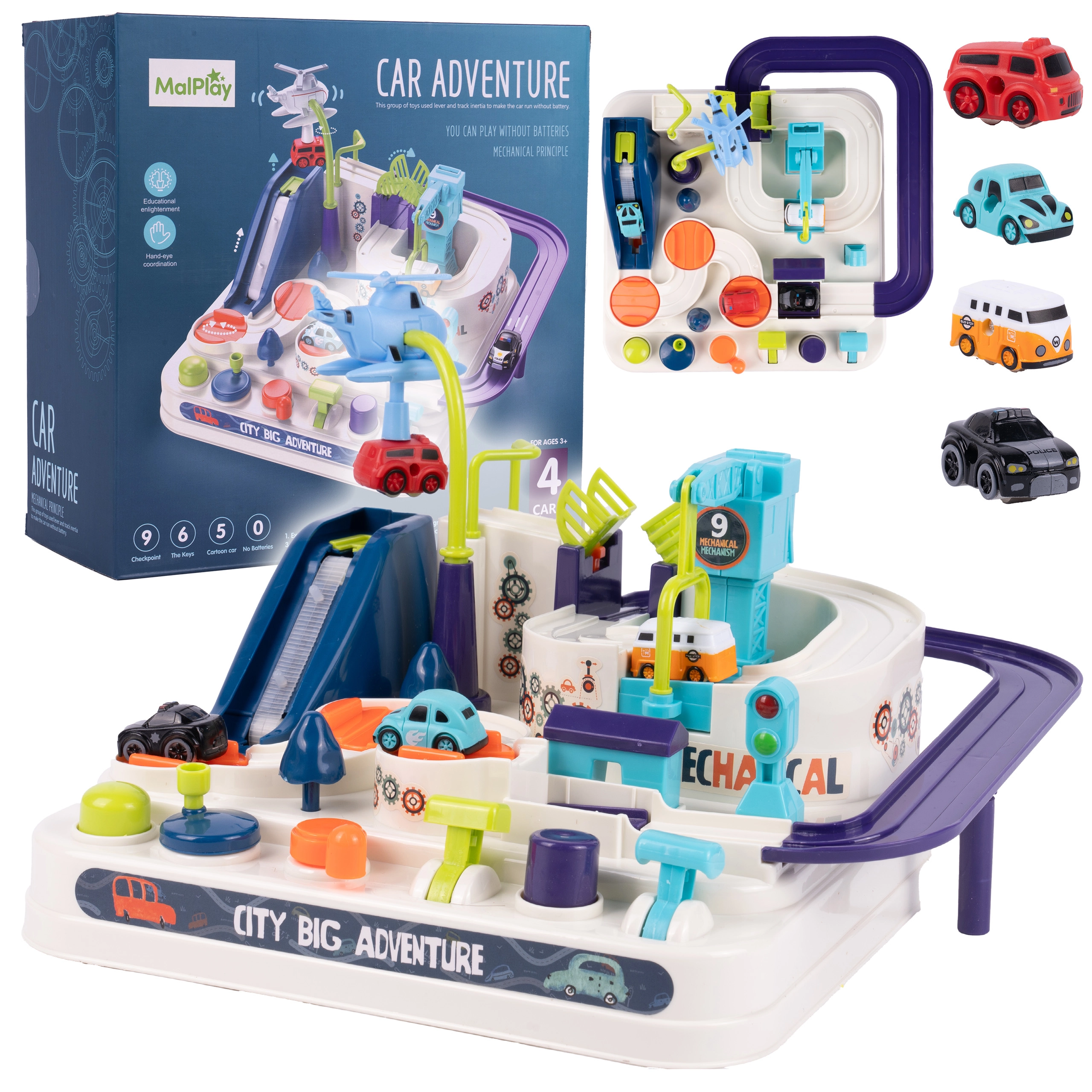 Construcția robustă din plastic de înaltă calitate asigură o durată lungă de viață, în timp ce cele patru mașinuțe incluse permit curse imediate și distracție împărtășită cu prietenii sau frații. Ideal ca un cadou care susține motricitatea fină, gândirea logică și abilitățile de coordonare.