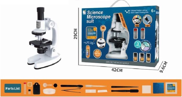 Setul include 16 accesorii care stimulează creativitatea și învățarea. Corpul compact din material plastic durabil și dimensiunile de 25 × 14 × 8,7 cm sunt potrivite pentru mâinile copiilor. Alimentarea se face cu 2× baterii AA (nu sunt incluse), astfel încât microscopul poate fi folosit oricând și oriunde.