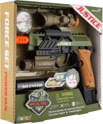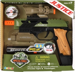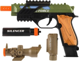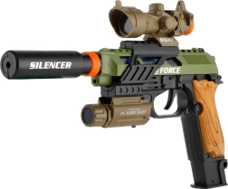 Acest pistol de plastic îi va încânta pe toți micii aventurieri. Datorită aspectului realist și efectelor de lumină și sunet, aduce mai multă distracție și acțiune în orice joc. Sunt incluse vizorul, lumina și amortizorul, care accentuează senzația de autenticitate în timpul jocului.