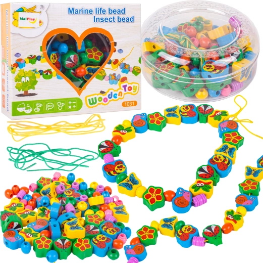 Set creativ de mărgele din lemn cu motiv de buburuză care va bucura atât copiii, cât și adulții. Conține șnururi lungi și multe mărgele colorate pentru înșirat. Susține motricitatea fină, creativitatea și răbdarea în realizarea colierelor, brățărilor sau decorațiunilor originale.