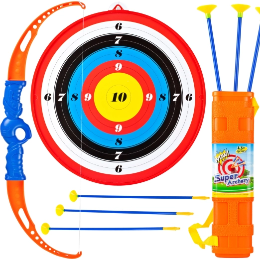 Set distractiv pentru micii arcași, care include un arc din plastic, un scut cu țintă și accesorii. Ideal pentru joacă acasă și în aer liber, dezvoltă coordonarea, precizia și motricitatea copiilor.
