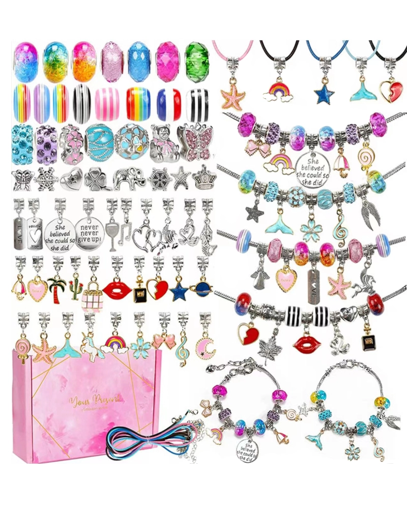 Descoperă distracția de a-ți crea propriile bijuterii cu acest set creativ pentru realizarea brățărilor. Setul conține 130 de piese, inclusiv mărgele colorate, mărgele distanțier metalice, mărgele cu pandantive, brățări și șnururi colorate. Ideal pentru copii de la 6 ani și perfect pentru dezvoltarea creativității și a motricității fine.