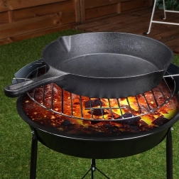 Datorită compatibilității cu toate tipurile de plite – pe gaz, electrice, vitroceramice, cu halogen și cu inducție – și posibilității de utilizare în cuptor sau direct pe foc, tigaia este o alegere excelentă atât pentru bucătărie, cât și pentru exterior. Două guri de scurgere integrate permit turnarea comodă a sosurilor și grăsimilor fără murdărie.