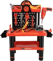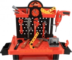 - 1× mașină de găurit, 2× ciocan, 1× cheie inelară dublă, 1× ruletă, 1× fierăstrău, 1× șurubelniță cu bit interschimbabil, 1× cheie tubulară, 1× șubler, 2× cheie franceză, 1× clește, cârlige pentru agățarea uneltelor, autocolante și alte accesorii