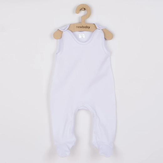 Salopete pentru bebeluși albe NEW BABY Classic din 100% bumbac de calitate, ideale pentru purtare zilnică. Oferă material moale și respirabil, închidere ușoară cu capse pe bretele și între piciorușe și un croi practic pentru libertatea de mișcare a bebelușului.