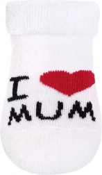 Șosete frotir moi pentru bebeluși, cu inscripțiile I ♥ MUM și I ♥ DAD, asigură căldură, finețe și confort la purtare în fiecare zi. Datorită mansetei elastice stau foarte bine pe picioruș, nu strâng și sunt ideale pentru cărucior și după baie.