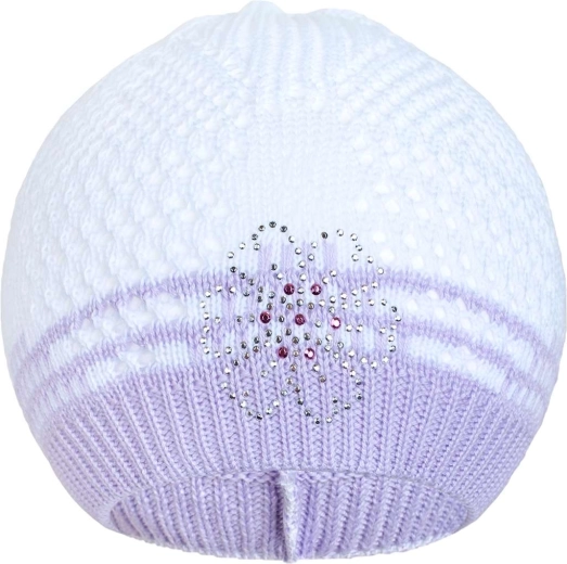 Căciulița tricotată stilată NEW BABY, în elegantul mov, este decorată cu o floricică delicată cu pietricele strălucitoare. Datorită compoziției naturale, este moale cu pielea copilului, permite o bună circulație a aerului și își menține forma.