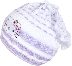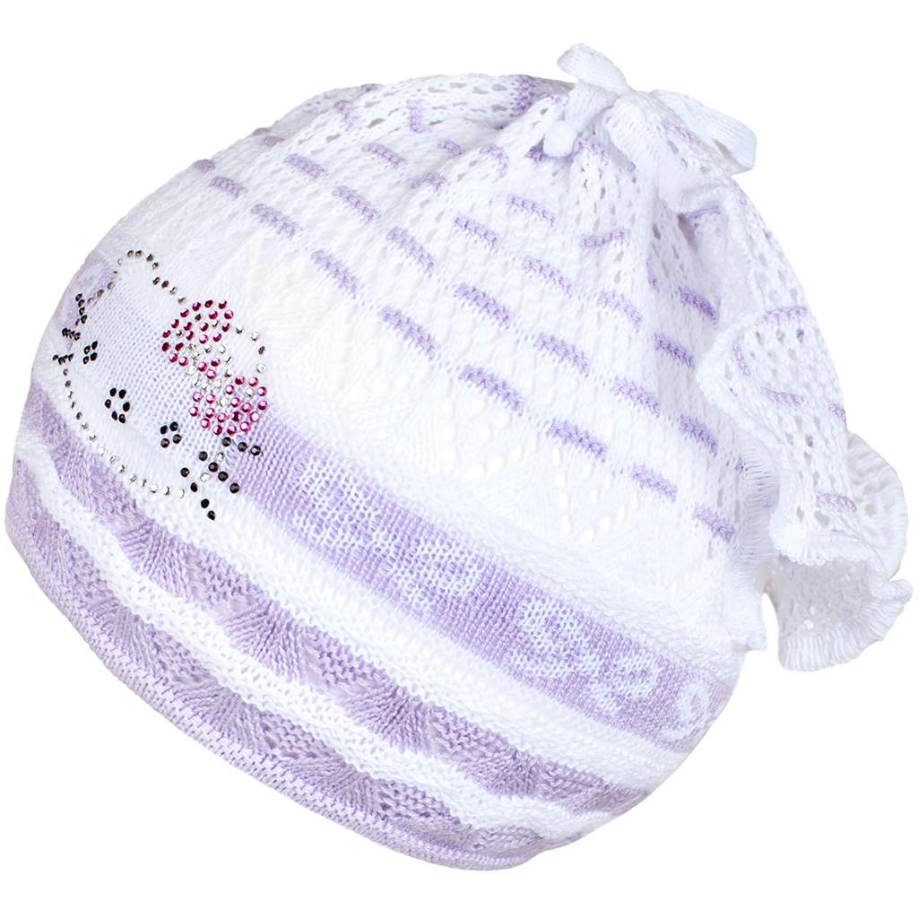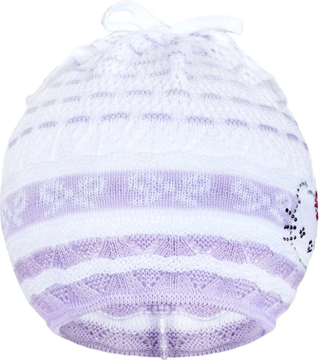 Căciuliță-esarfa tricotată de primăvară, drăgălașă, cu motiv de pisicuță și pietricele strălucitoare, va încânta orice mică domnișoară. Este din 100% bumbac, plăcut elastică și confortabilă, cu circumferință universală de aprox. 40–50 cm.