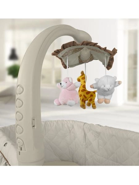 Caruselul integrat cu jucării din pluș oferă melodii, veioză de noapte și vibrații delicate. Volumul și intensitatea luminii se reglează ușor sau pot fi controlate cu telecomanda inclusă.