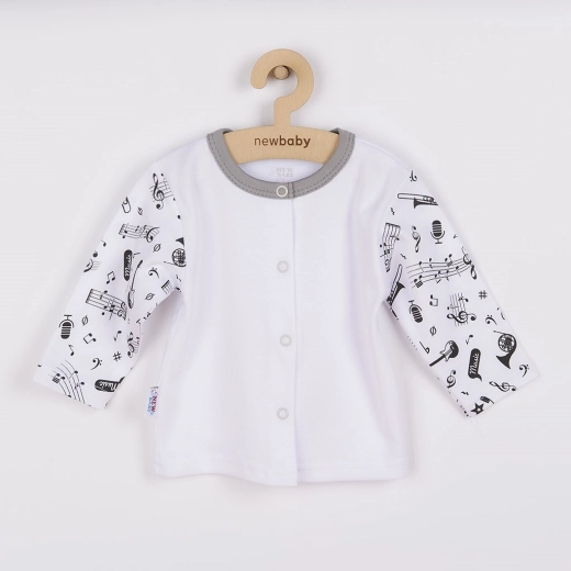 Jacheta NEW BABY Music combină un design simplu, într-o singură culoare, cu mâneci drăguțe imprimate cu note și instrumente muzicale. Datorită tricotului de bumbac de calitate, este respirabilă, moale și plăcută la atingere, asigurând bebelușului confort maxim pe tot parcursul zilei.