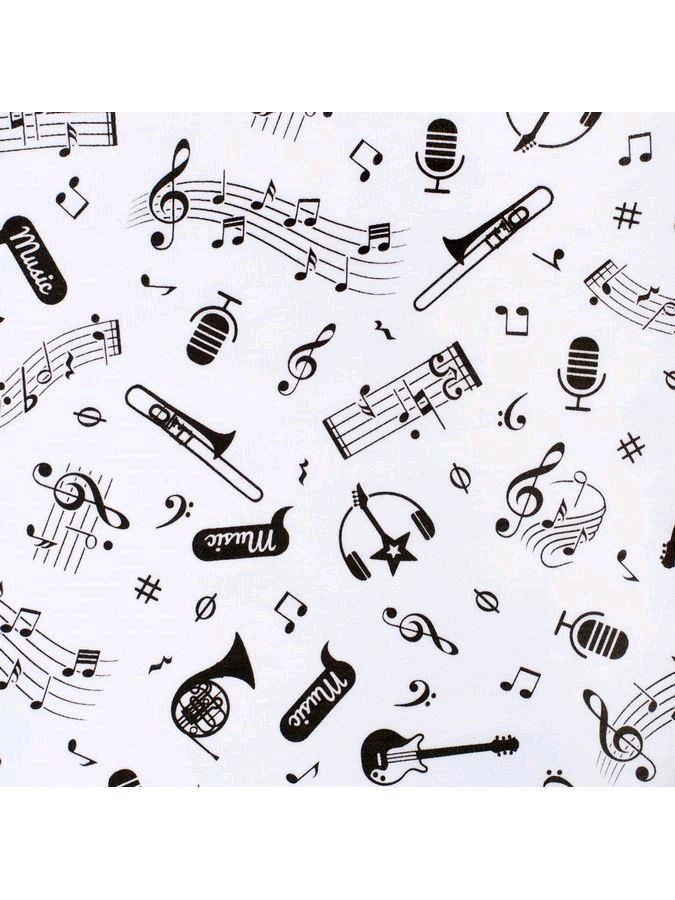 - Corp într-o singură culoare, mâneci cu imprimeu de note și instrumente muzicale