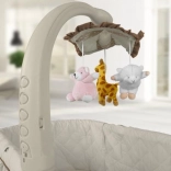 Caruselul cu jucării din pluș este completat de modulul electronic cu melodii, vibrații delicate și lumină de noapte – ideal pentru relaxare și adormire ușoară. Totul se controlează cu telecomanda. Datorită roților cu blocare, leagănul se mută ușor prin casă; după demontarea lor, se transformă în pătuț balansoar. Coșul inferior oferă spațiu practic pentru scutece și accesorii la îndemână.