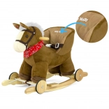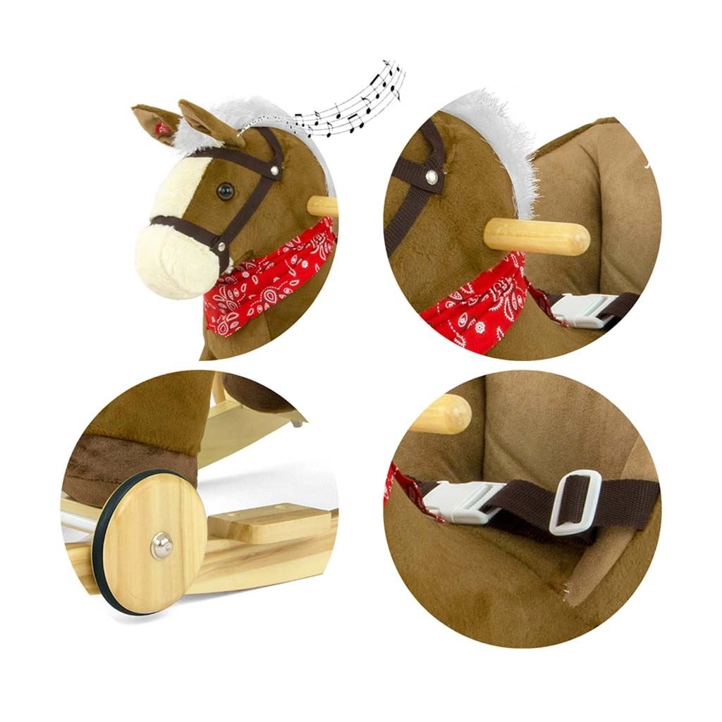 Căluțul, la apăsarea urechilor, redă nechezat vesel și sunet de trap, stimulând percepția senzorială și dezvoltând imaginația copiilor. Șinele din lemn cu reazeme pentru picioare și mânerele ferme ajută copiii să își mențină echilibrul. În plus, șinele pot fi ușor deșurubate pentru depozitare sau transport comod.