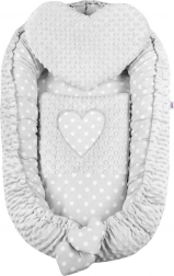 Cuibușorul NEW BABY Minky inimioară în variantă gri este un ajutor practic pentru primele luni de viață. Datorită execuției reversibile îl puteți folosi în funcție de nevoie – pe o parte Minky fin cu bobițe pentru stimulare senzomotorie, pe cealaltă parte 100% bumbac respirabil. Prin strângerea șnurului ajustați cu ușurință spațiul interior și creați bebelușului un loc primitor și protejat.
