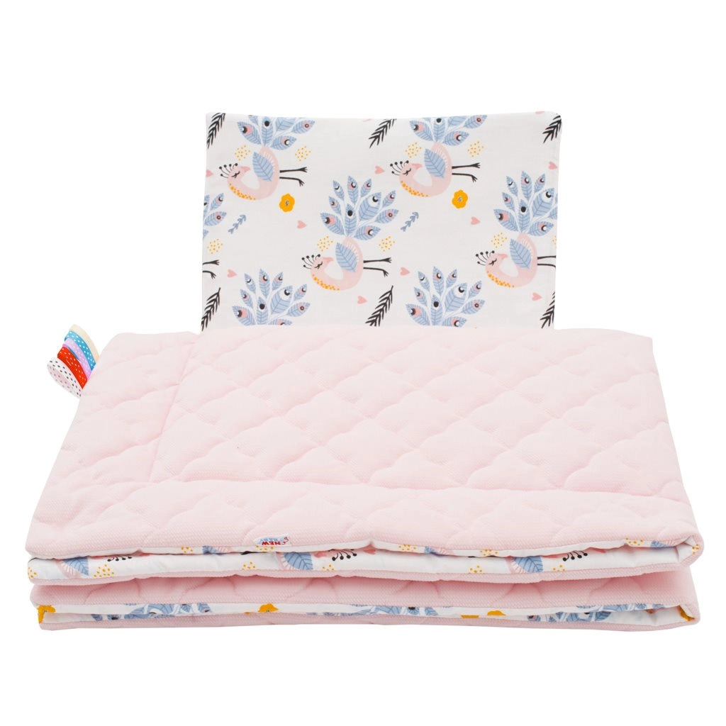 Setul reversibil din material Velvet de la brandul cehesc New Baby este alegerea ideală pentru confortul bebelușului acasă și în deplasare. O față este din bumbac fin cu model liniștitor de păuni, cealaltă din catifea moale Velvet, care încălzește excelent și își păstrează forma. Panglicile colorate de pe pătură atrag atenția bebelușului și susțin dezvoltarea senzorială.