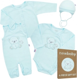 Set stilat din 4 piese NEW BABY Sweet Bear, în nuanță delicată de albastru, ideal ca primul set pentru maternitate și ca dar practic. Include body cu deschidere completă, salopetă cu botoșei, jachetă cu capse și căciuliță cu legători. Fabricat din 100% bumbac pentru pielea sensibilă a bebelușului, cu drăguța broderie cu ursuleț și păsărică și ambalaj în cutie cadou eco.
