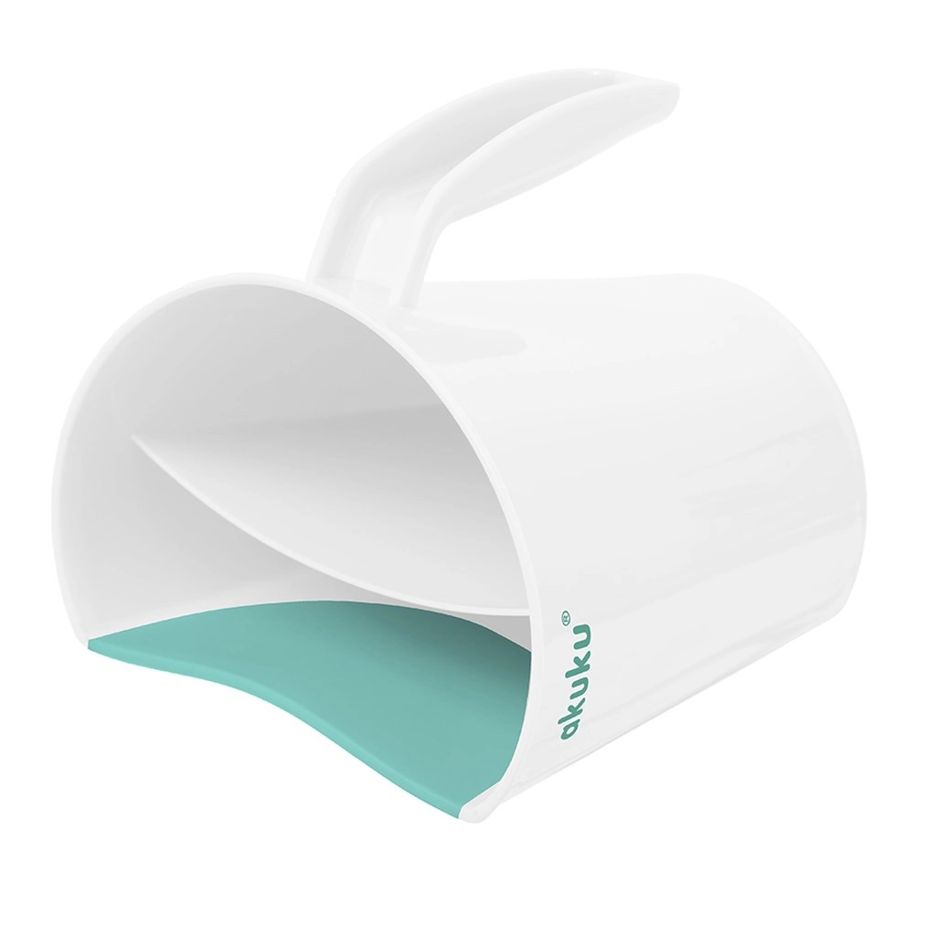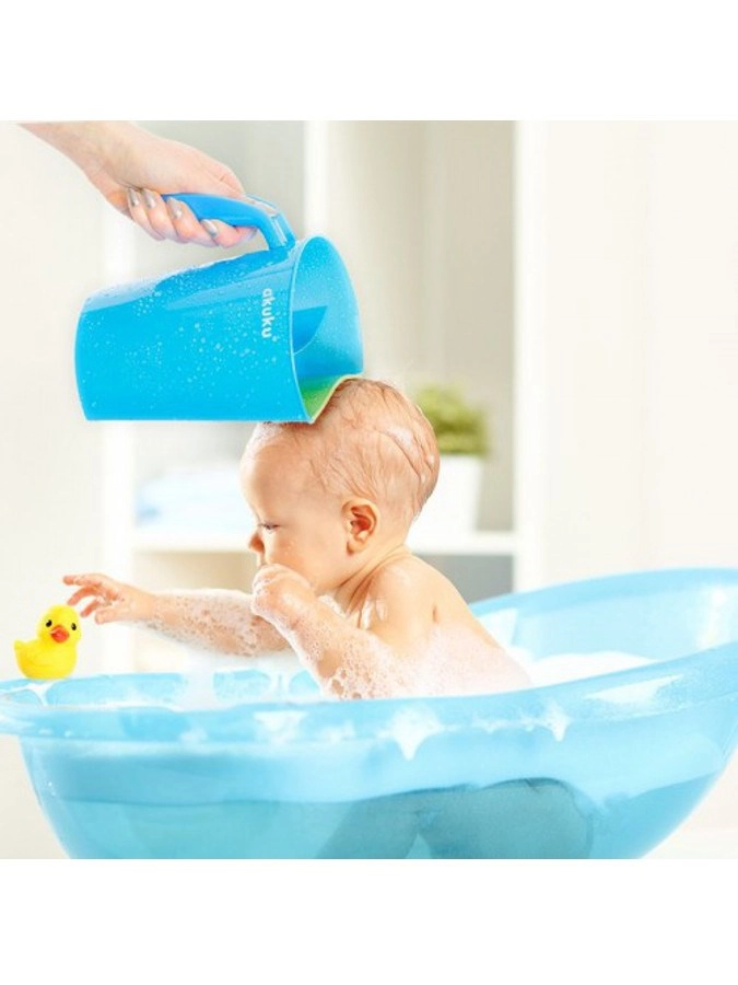 Recipientul AKUKU în variantă alb-mentă este un ajutor inteligent pentru baia zilnică a bebelușilor și copiilor mai mari. Marginea moale și adaptabilă se așază delicat pe frunte și direcționează jetul de apă astfel încât să nu ajungă în ochi. Două camere separate permit turnare controlată și clătire uniformă a șamponului și spumei.