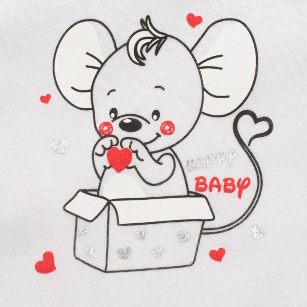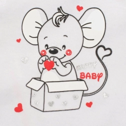 Acest set pentru bebeluși New Baby Mouse este conceput pentru confort maxim și manipulare ușoară. Jacheta este uni și se închide cu capse pe toată lungimea, facilitând îmbrăcarea fără a fi nevoie să fie trasă peste cap. Salopeta este decorată cu tiv colorat și un motiv drăguț cu șoricel, care va încânta pe oricine.