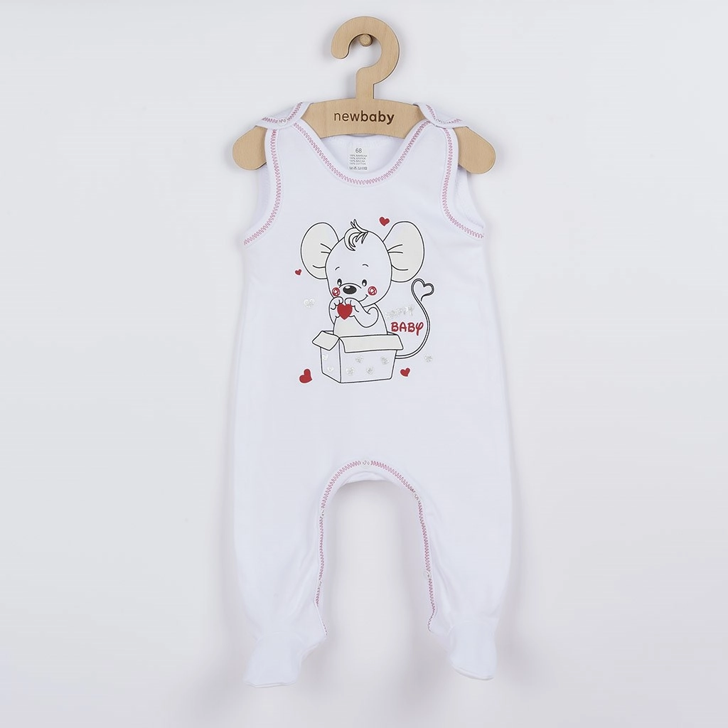 Adorabilul set pentru bebeluși New Baby Mouse, în culoare albă, oferă confort și practicitate pentru purtarea zilnică. Include salopetă și jachetuță din 100% bumbac, blând cu pielea copilului. Închiderea cu capse pe toată lungimea jachetuței și pe umăr, precum și între piciorușe la salopetă, ușurează îmbrăcarea și schimbarea. Salopeta este decorată cu un motiv mare cu șoricel și cu tiv colorat. Marcă cehă.