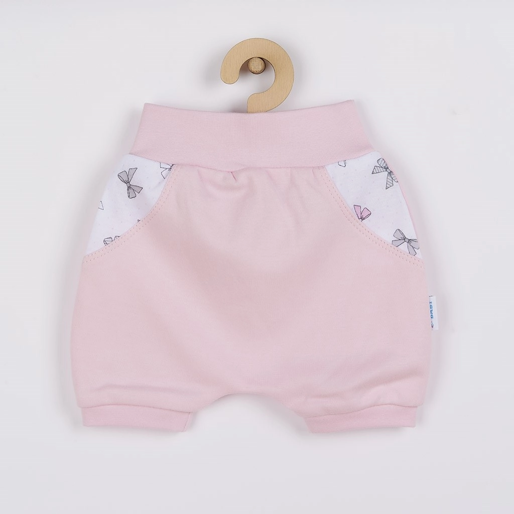 Acest set roz din 3 piese NEW BABY Perfect Summer este ideal pentru zilele călduroase. Body-ul cu mânecă scurtă este decorat cu un motiv pentru copii și are margini colorate la gât, mâneci și la picioare. Închiderea practică cu capse între picioare grăbește îmbrăcarea și schimbarea scutecului. Pantalonașii scurți au în talie o betelie elastică lată, iar la tivurile picioarelor margini mai înguste pentru purtare confortabilă fără urme de presiune. Bentița elastică se adaptează bine la căpușor și rămâne pe poziție.