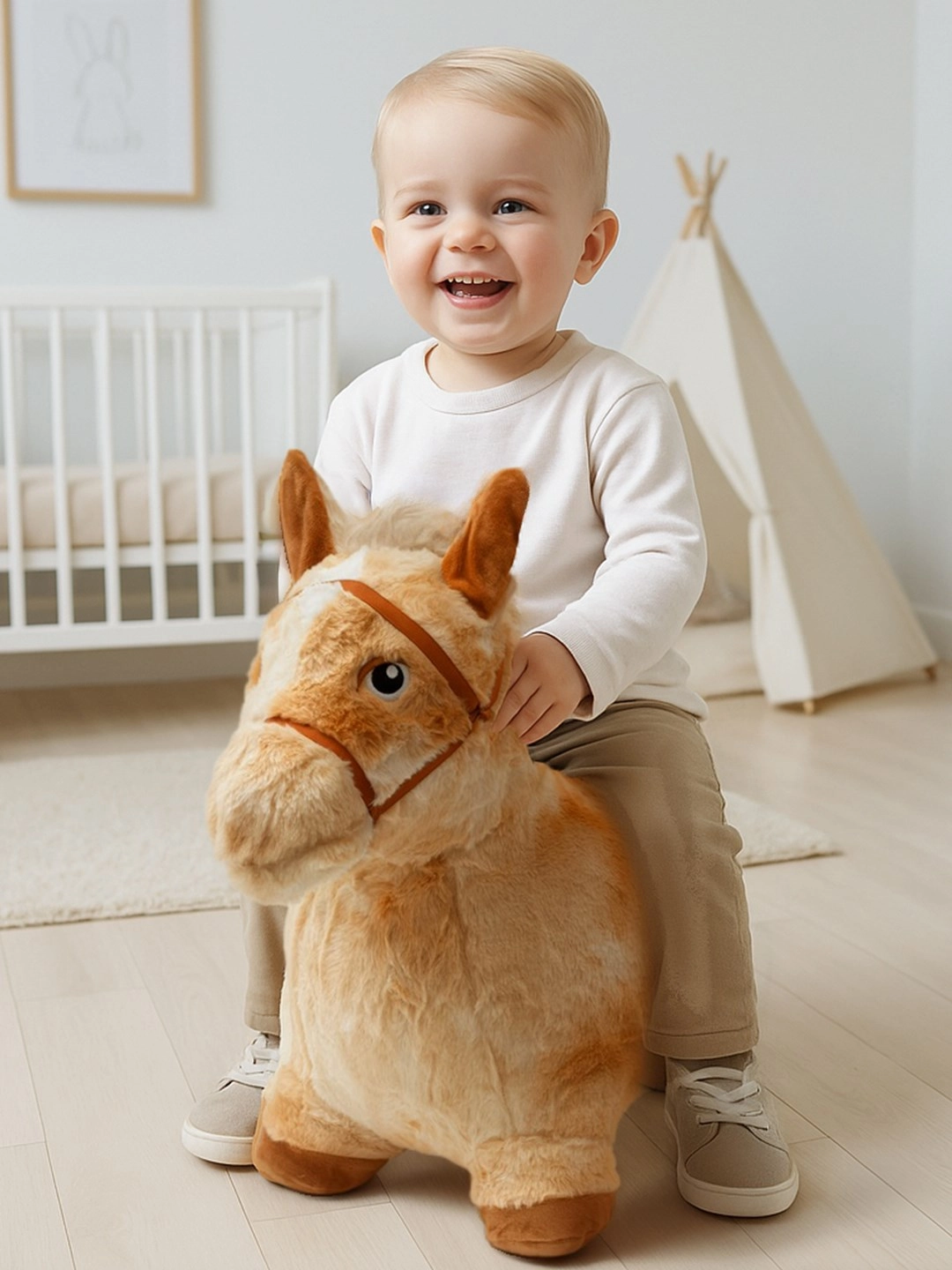Căluțul săltăreț din pluș PLAYTO îmbină distracția, mișcarea și siguranța. Corpul gonflabil este acoperit cu pluș fin și plăcut, care asigură priză confortabilă și stabilitate în timpul jocului. La apăsarea urechilor, căluțul redă sunete fidele, stimulând imaginația și prelungind distracția.