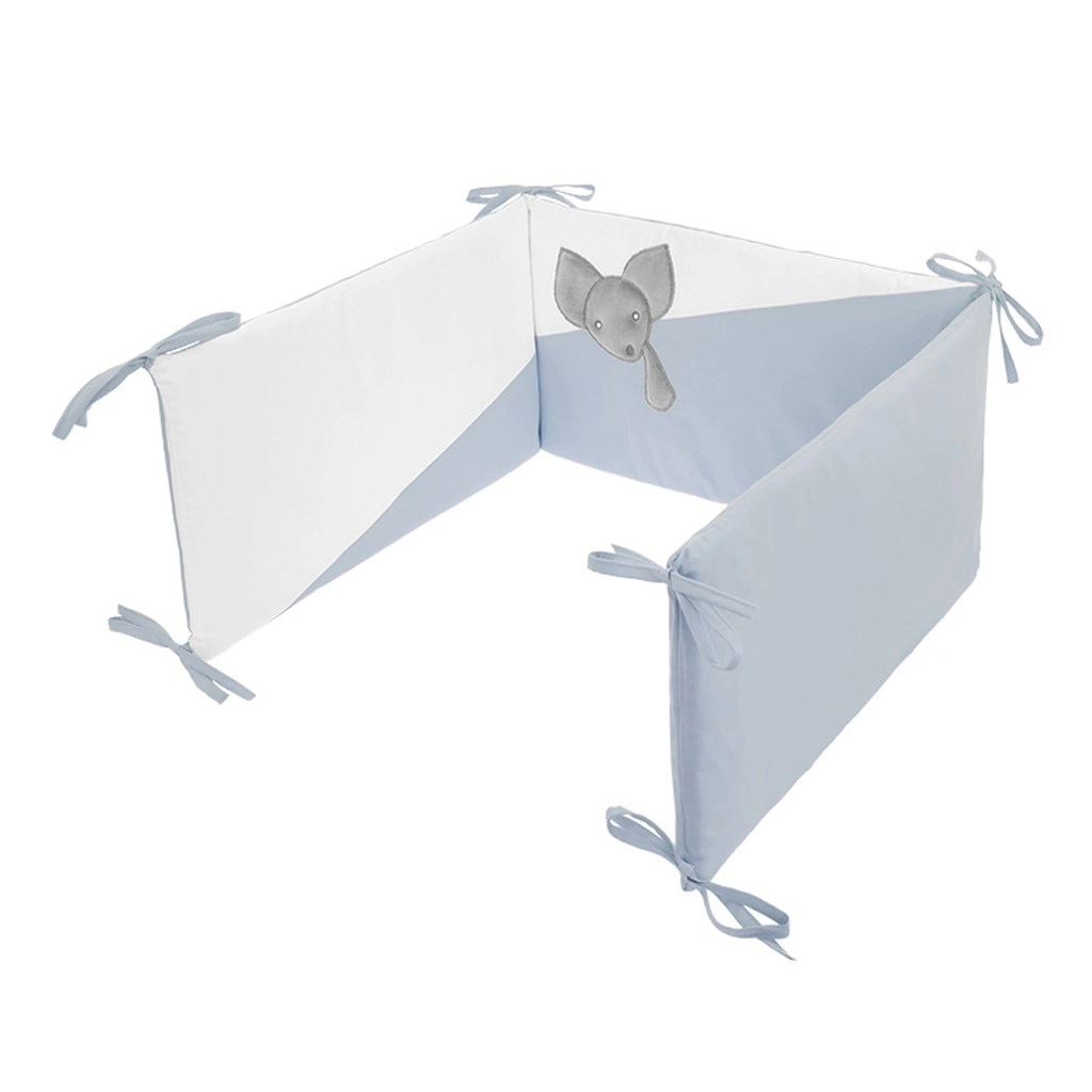 Apărătoarea de 180 cm, practică, cu umplutură moale și legături, ajută la protejarea copilului de gratiile dure ale pătuțului și creează un mediu plăcut pentru un somn sigur. Aplicațiile cu șoricei și paleta alb-albastru delicată se potrivesc în orice cameră de copil.