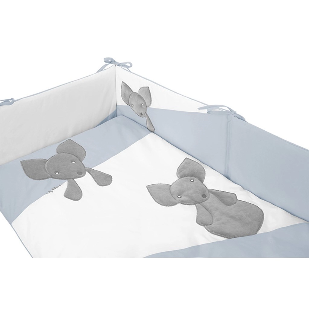 Acest set de calitate pentru pătuț este confecționat din bumbac 100%, plăcut la atingere și blând cu pielea sensibilă a copiilor. Motivul îndrăgit cu șoricei și paleta liniștitoare în tonuri de albastru, alb și gri completează frumos camera copilului. Construcția practică, cu fermoare sigure, fără cheițe atârnate, sporește siguranța în utilizarea zilnică.