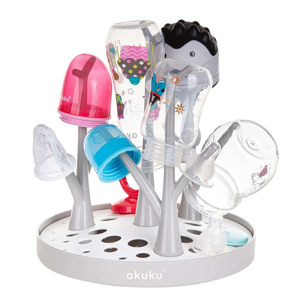 Uscătorul pentru biberoane și accesorii AKUKU este alegerea ideală pentru părinții care doresc ca obiectele pentru bebeluși să fie mereu uscate și gata de utilizare. Sistemul tip copac cu țăruși menține biberoanele, tetinele și capacele în poziție verticală, pentru ca apa să se scurgă rapid și aerul să circule liber. Dimensiunile compacte și construcția pliabilă permit transportul și depozitarea ușoară, fiind potrivit atât pentru bucătărie, cât și pentru geanta de călătorie.