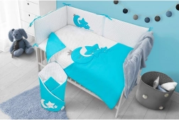 Setul drăguț de 3 piese pentru pătuț BELISIMA Magic Stars, în culoare turcoaz, oferă bebelușului confort moale, fermoare sigure și bumbac 100% fin. Conține husă pentru pilotă 100×135 cm, față de pernă 40×60 cm și apărătoare pătuț de 180 cm, cu motiv liniștitor de lună și steluțe.