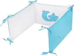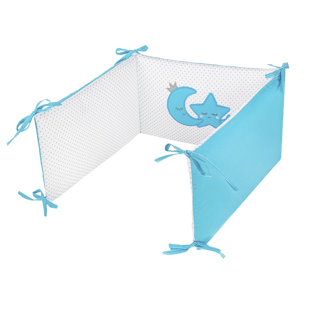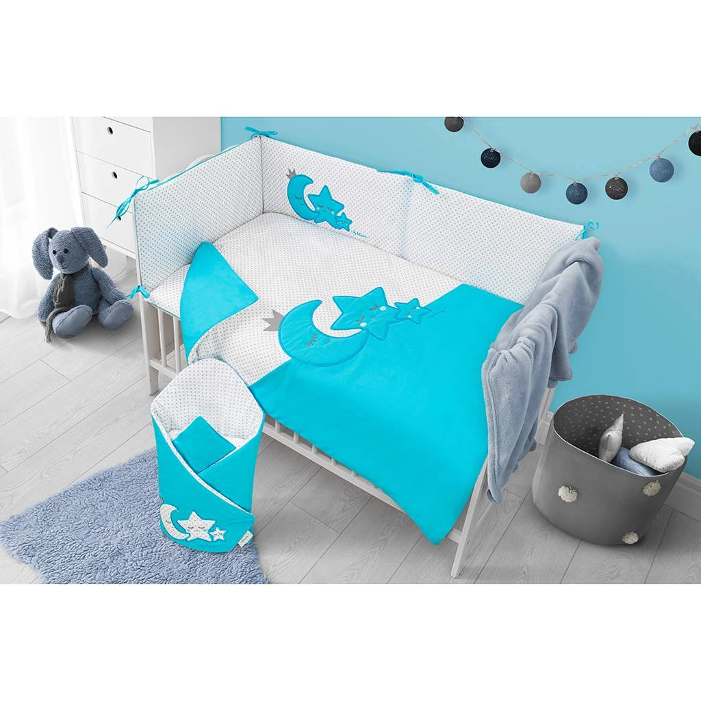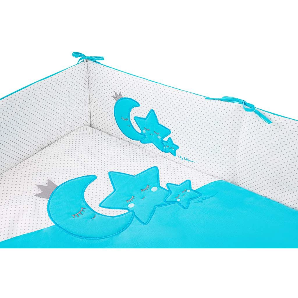 Setul moale pentru pătuț BELISIMA Magic Stars, în culoare turcoaz, oferă confort, siguranță și un somn liniștit pentru bebeluș. Include huse 40 × 60 și 100 × 135 cm, apărătoare (bumper), umpluturi pentru pernă și pilotă, precum și baldachin. Fabricat din 100% bumbac cu umplutură hipoalergenică, fermoare sigure fără cursoare libere, fără nasturi și fără piese dure.