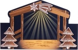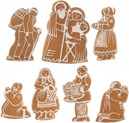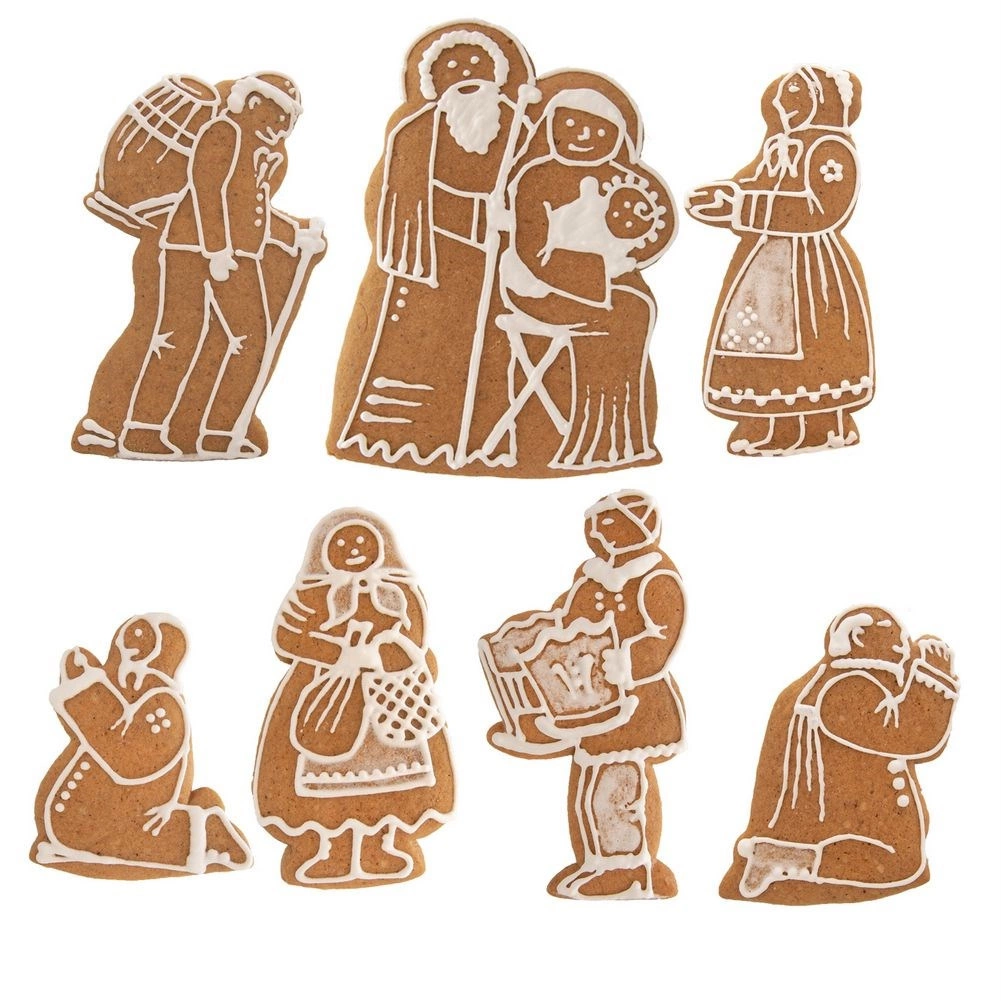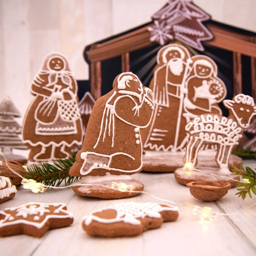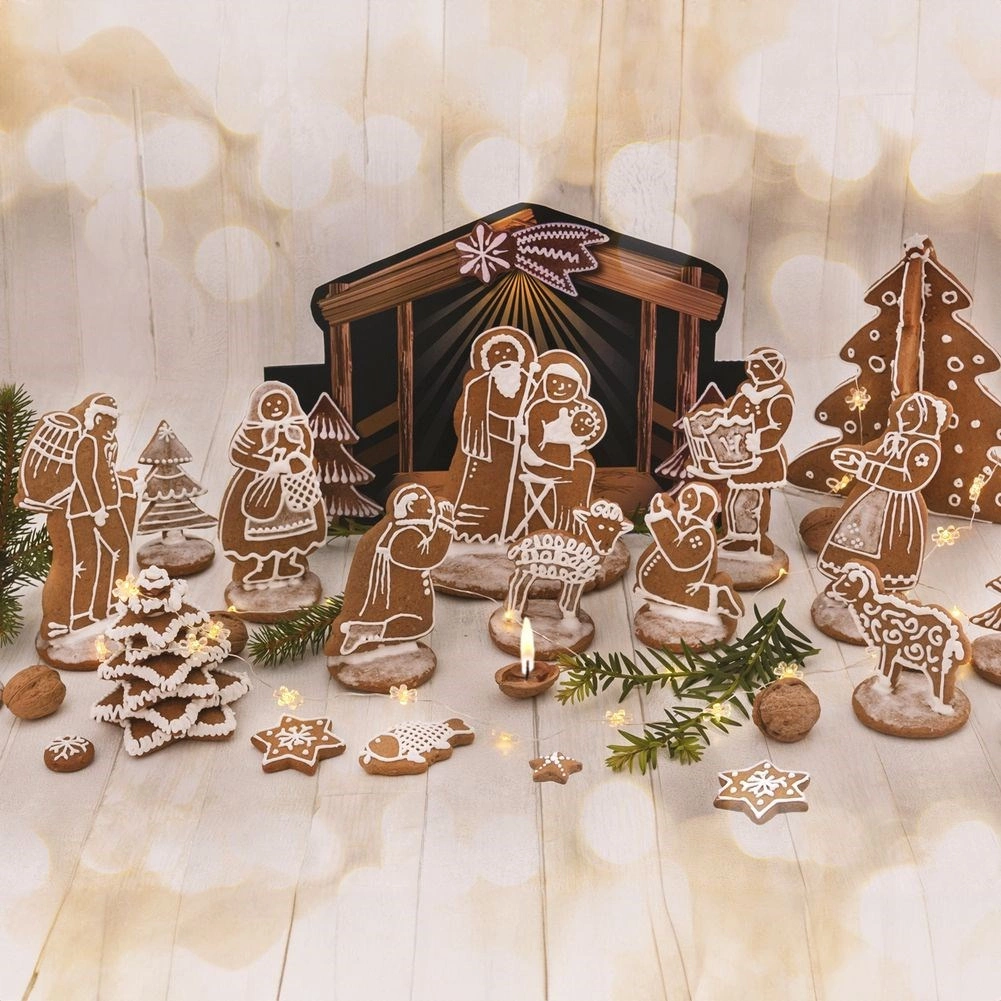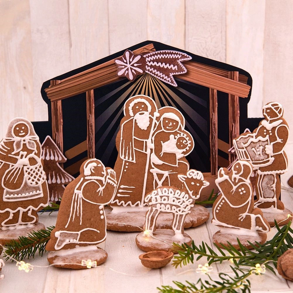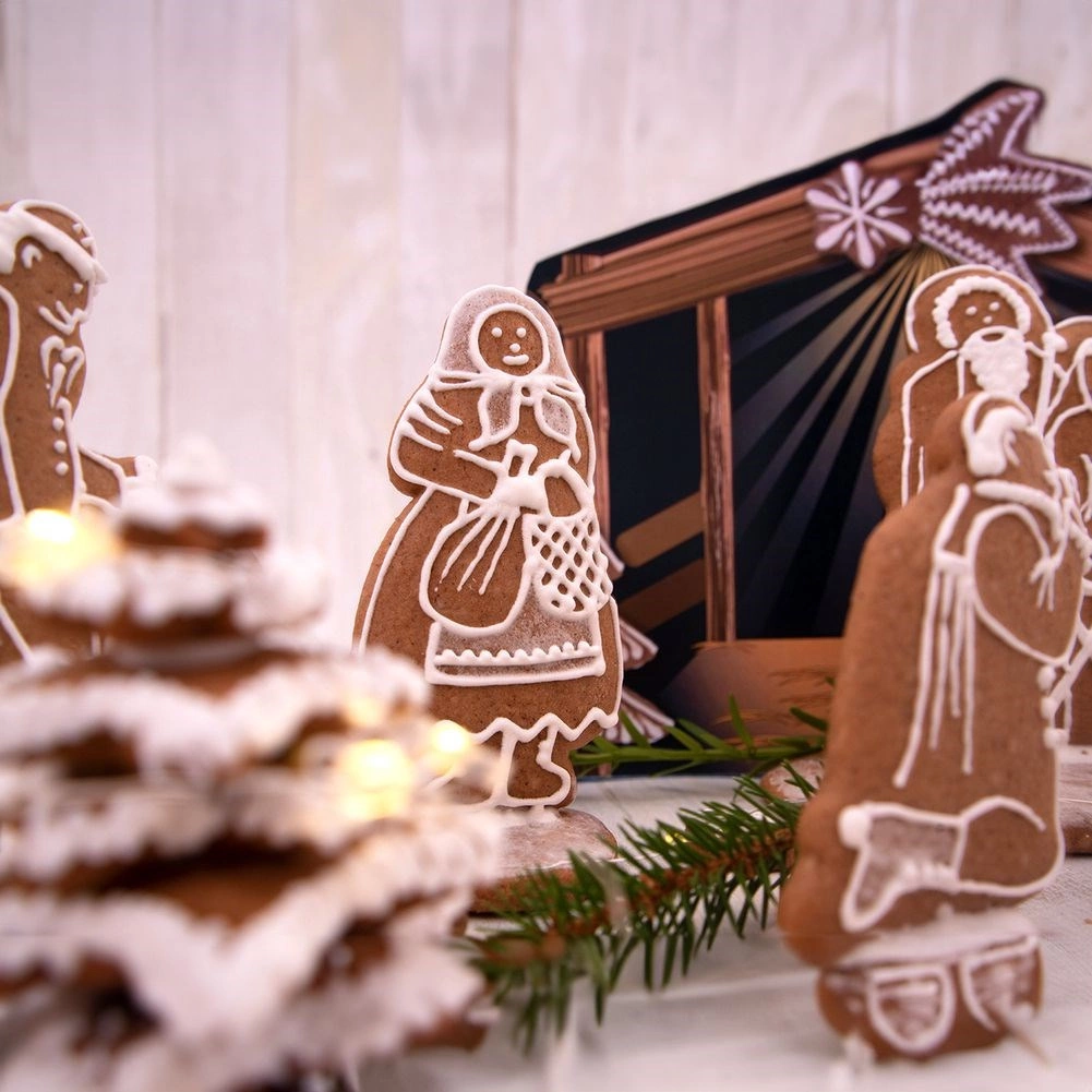 Setul include personajele ieslei și un fundal decorativ, astfel încât după coacere creați ușor o decorațiune de Crăciun impresionantă pentru masă sau pervaz.