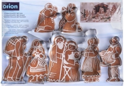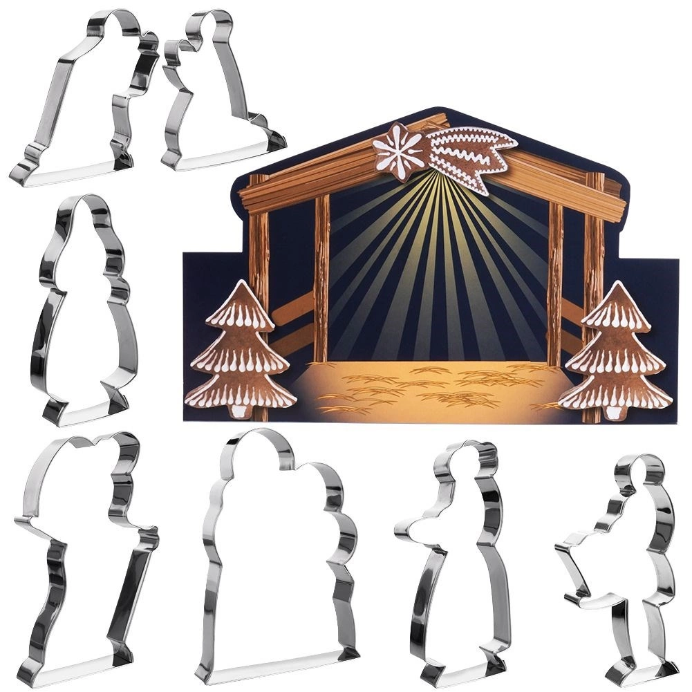 Cu setul de forme de Crăciun decupați cu ușurință silhuete precise ale personajelor și animalelor din scena Nașterii și creați o decorațiune de Crăciun originală și prăjituri delicioase. Lățimea fiecărei forme este de aproximativ 2–9 cm, iar lungimea 7–12 cm – ideale pentru turtă dulce și aluat de biscuiți. Fundalul din carton color servește la completarea întregii scene.