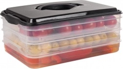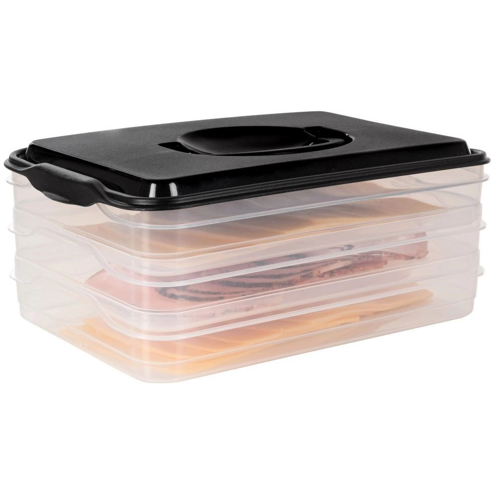 Acest organizator inteligent pentru alimente oferă trei niveluri separate, transparente, pentru depozitarea comodă a brânzeturilor feliate, a mezelurilor și a ingredientelor mici fără amestecarea mirosurilor. Forma compactă, dreptunghiulară, se potrivește perfect pe rafturile frigiderului, iar capacul negru robust cu mâner asigură o manipulare ușoară.