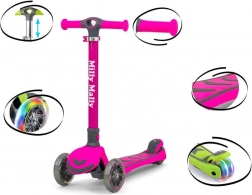 Trotineta pentru copii Milly Mally Boogie în culoare roz oferă o structură ușoară și rezistentă din aluminiu, design stabil cu trei roți și roți PU luminoase pentru o plimbare sigură și distractivă. Datorită ghidonului reglabil, platformei antiderapante și frânei spate, este ideală pentru copii de la 3 ani, până la 50 kg.