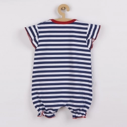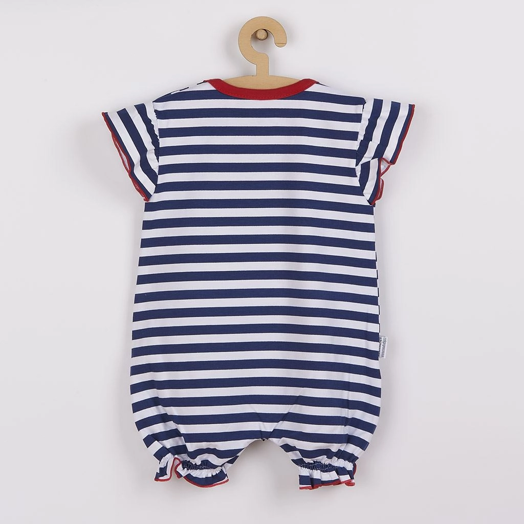 Adorabila salopetă pentru fete NEW BABY Marine, din bumbac moale 100%, este ideală pentru vară. Are mâneci scurte cu volănașe, design modern în dungi și aplicație cu ancoră cu căptușeală pe dos împotriva zgârierii. Datorită închiderii practice cu capse pe umăr și între piciorușe, se îmbracă și se schimbă ușor.