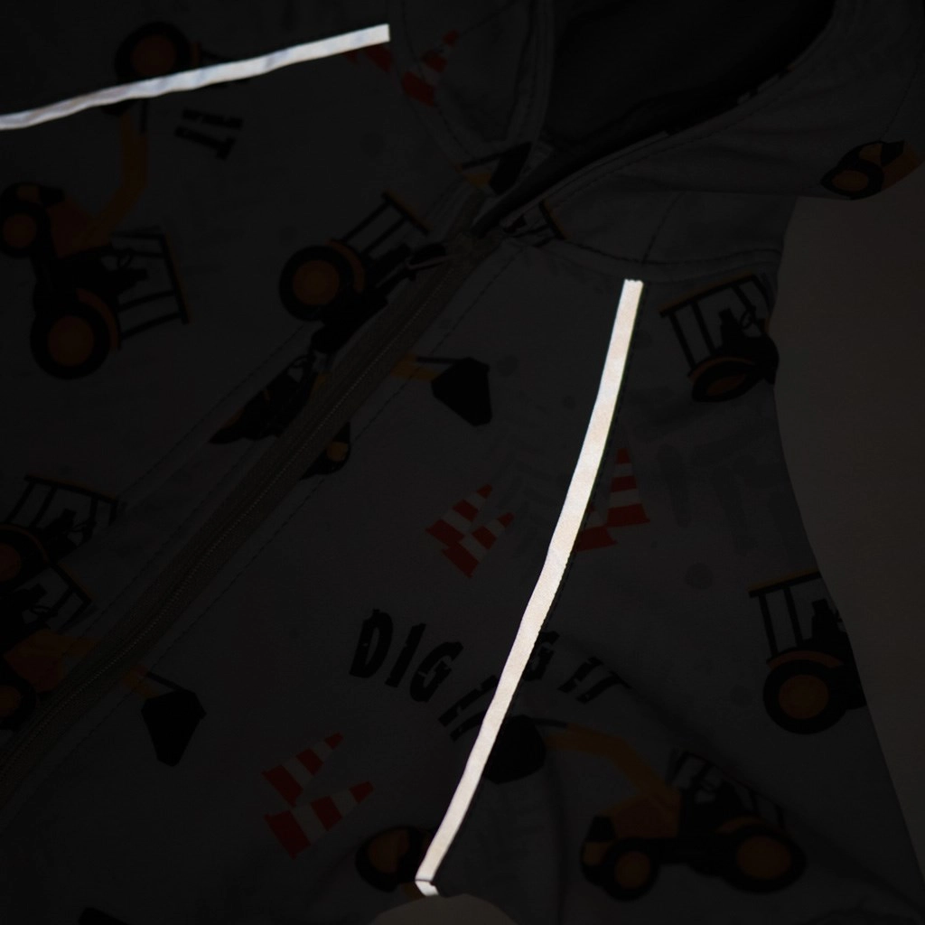 Detalii gândite cu grijă, precum fermoarul pe toată lungimea căptușit pe dedesubt împotriva trecerii vântului, gluga și mansetele elastice mai late la mâneci și la picioare sporesc confortul. Materialul este neted, elastic și moale la atingere, totodată rezistent la murdărie și nu absoarbe apa. Paspelurile reflectorizante de pe mâneci îmbunătățesc vizibilitatea în condiții de vizibilitate redusă.