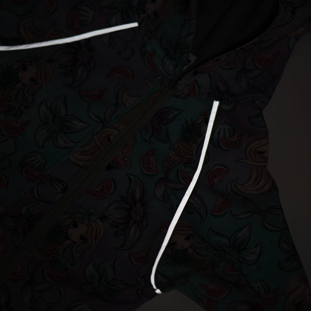 Fermoarul pe toată lungimea este căptușit cu material care previne pătrunderea vântului, astfel încât schimbatul și îmbrăcatul sunt rapide și comode. Gluga practică, manșetele elastice mai late la mâneci și la tivul pantalonilor, precum și paspoalele reflectorizante de pe mâneci sporesc siguranța și funcționalitatea în utilizarea zilnică.