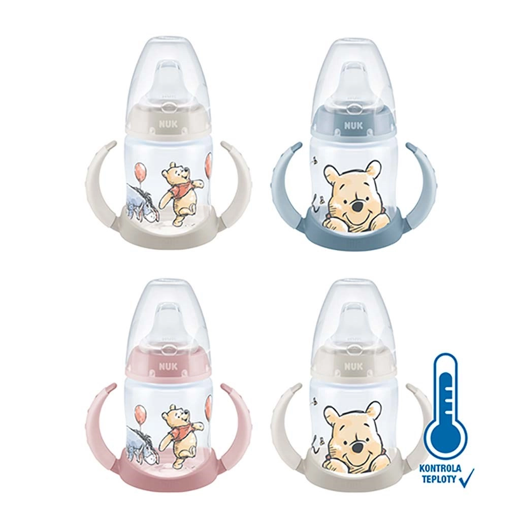 Biberonul de învățare NUK cu motivul URSULEȚUL POOH îi ajută pe copii să treacă la băutul independent. Datorită indicatorului de temperatură integrat, puteți recunoaște în siguranță dacă băutura este prea fierbinte – dunga albastră devine albă când temperatura este ridicată. Sticla are un muștiuc din silicon moale, anti-picurare, formă ergonomică și mânere antiderapante pentru prindere ușoară. Nu conține BPA și se demontează și se curăță ușor.