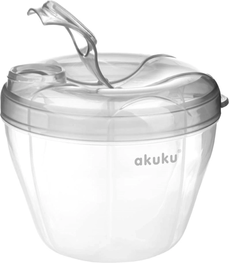 Dozatorul practic pentru lapte praf AUKU, în culoare gri, cu 4 compartimente separate, facilitează prepararea hranei pentru bebeluși acasă și în călătorii. Este fără BPA, potrivit de la naștere și se poate spăla în mașina de spălat vase și în sterilizator.