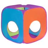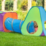 Setul 3‑în‑1 aduce copiilor multă mișcare, imaginație și bucurie. Două corturi colorate sunt conectate de un tunel flexibil, care se introduce ușor în corturi – nu este fix, astfel încât îl puteți manevra liber și schimba configurația. Datorită greutății reduse și structurii pliabile, setul este ușor de transportat și gata de joacă în câteva clipe.