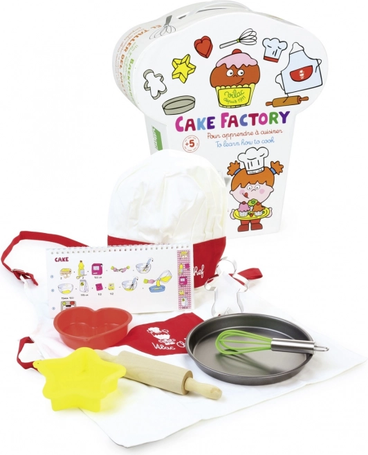 Vilac Învățați să coaceți este un set minunat pentru micii cofetari, care le stimulează creativitatea și imaginația prin jocul de roluri. Conține tot ce este necesar pentru a coace—șorț, bonetă de șef bucătar, forme de tăiat și altele.