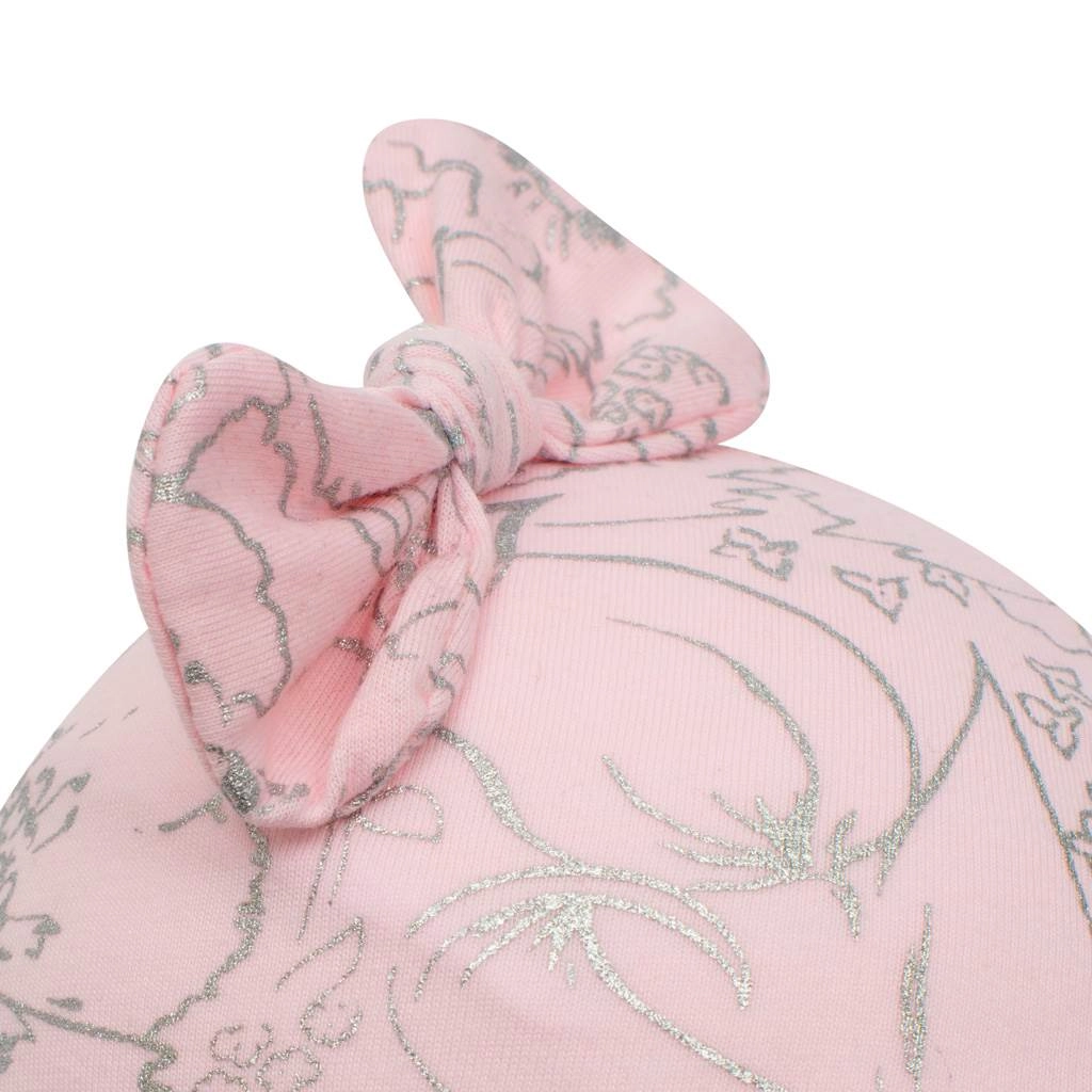 Căciulița adorabilă pentru bebeluși New Baby Nunu în culoare roz îmbină bumbacul moale, confortul elastic și acoperirea practică a urechiușelor. Are legare cu șnururi pentru fixare sigură, este căptușită integral pentru confort sporit și este decorată cu o fundiță și un model discret sclipitor.